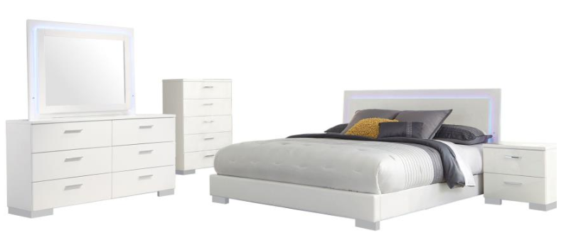 Includes: One (1) California king bed, one (1) nightstand, one (1) dresser, one (1) LED dresser mirror, and one (1) chest