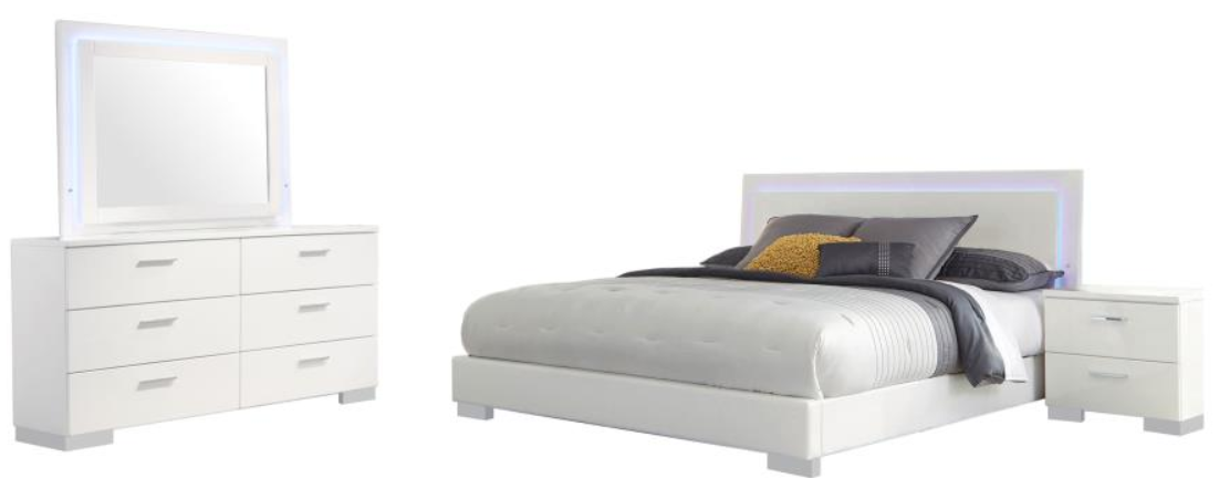 Includes: One (1) California king bed, one (1) nightstand, one (1) dresser, and one (1) LED dresser mirror