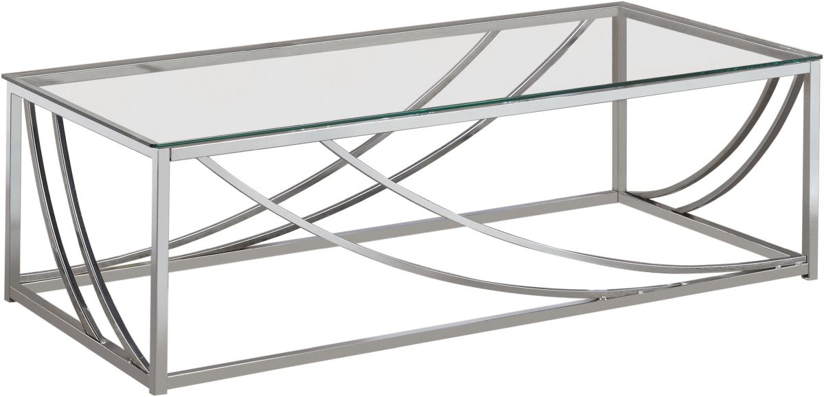 Complete with a sleek glass top, this modern coffee table oozes elegance. Add luxury with the sleek silhouette and chrome finish. Elevated with thin swoop accents, the open base celebrates modern design.Read More