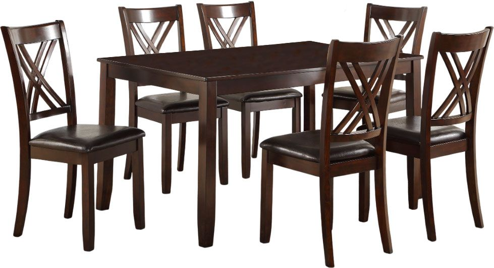 Introducing our contemporary dining ensemble, where sleek design meets timeless functionality. Boasting a rich espresso finish, this set adds a touch of warmth to any dining space. The table's clean lines and minimalist design are beautifully complemented by the chairs, which feature distinctive cross-back detailing and plush faux leather seating for added comfort.Read More