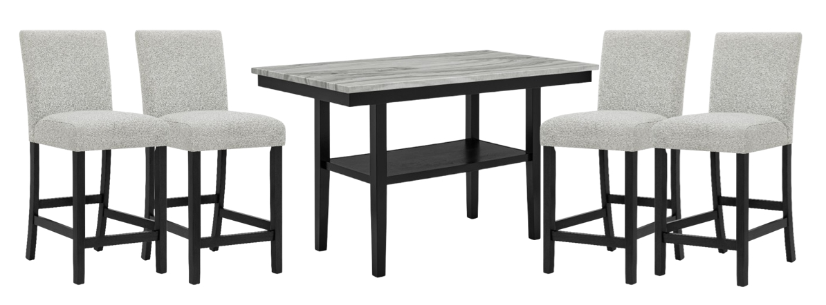 Elevate your dining experience with this sophisticated counter height group that blends contemporary design with functional elegance. The standout feature is the faux marble tabletop, which adds a luxurious touch while offering durability and easy maintenance. Supported by a bold, dark-finished base, the table is paired with comfortably cushioned chairs and matching bench.Read More