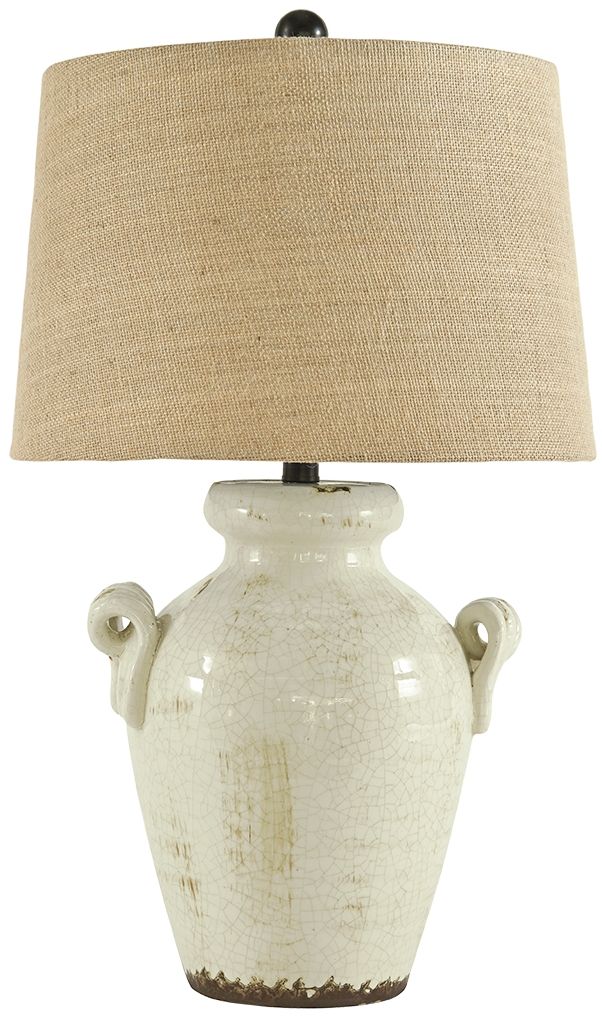This table lamp illuminates with vintage-inspired style. Antiqued cream glazed ceramic base boasts a crackle effect. Vase shape with the appearance of handles sits beautifully on end table. Perfect for farmhouse and cottage chic spaces.Read More
