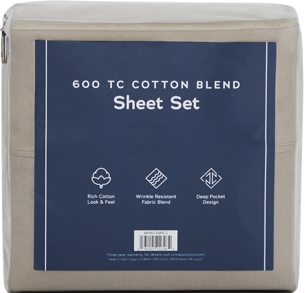 600-thread-count blend featuring 52% cotton, 42% polyester, and 5% Lyocell