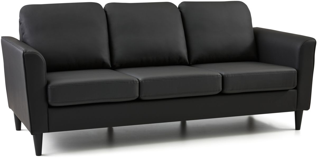 The Weekender® Atwood black faux leather sofa has a transitional style with a curved arm, removable cushions with thick memory foam and zippered covers.Read More